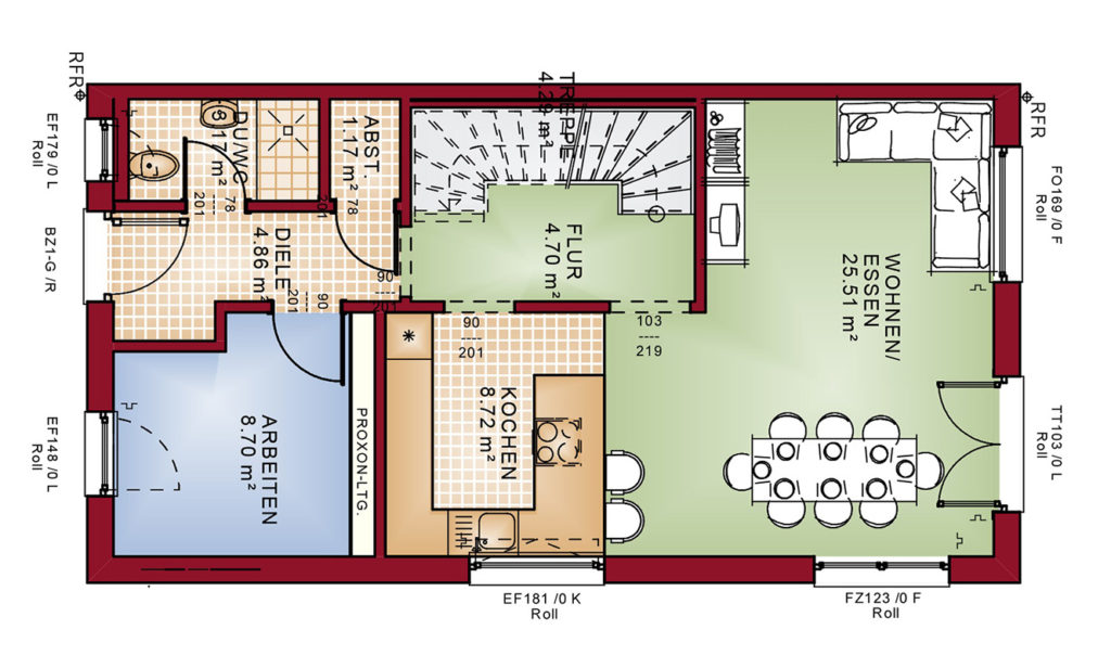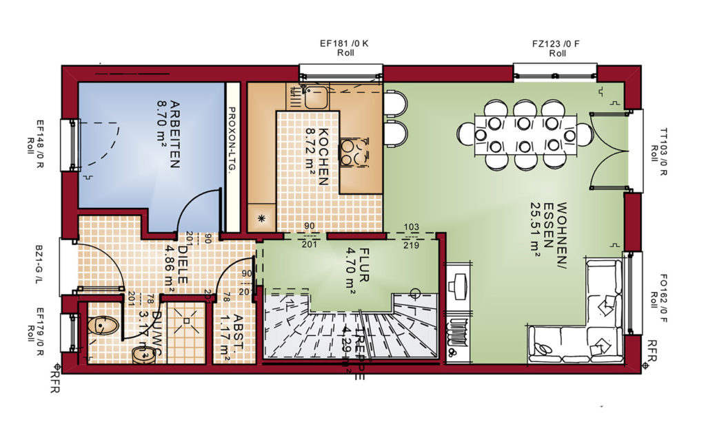 Durch modernste Technik und optimalen Wärmeschutz handelt es sich hier um förderfähige Effizienzhäuser mit dem KfW 55 Baustandard. Ein KfW-55-Effizienzhaus benötigt nur 55 % der Energie eines normalen Neubaus, welches den Vorgaben der EnEV entspricht.
